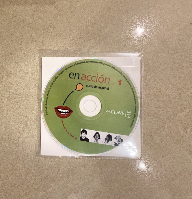 Prodam NOV originalen audio CD MP3 En Acción 1: Curso de español No. 1 (A1-A2) z aktivnostmi, ki so prijetne za poslušanje tako za samostojno učenje doma ali ponavljanje za slušno razumevanje v avtu, ali kot dodatek k učbeniku En acción: Libro del alumno, avtorji E. Verdia, M. González, F. Martin, I. Molina in C. Rodrigo (enClave ELE), ki ga za španščino kot drugi ali tretji tuji jezik uporabljajo v gimnazijskem in srednjem tehniškem oz. strokovnem izobraževanju.