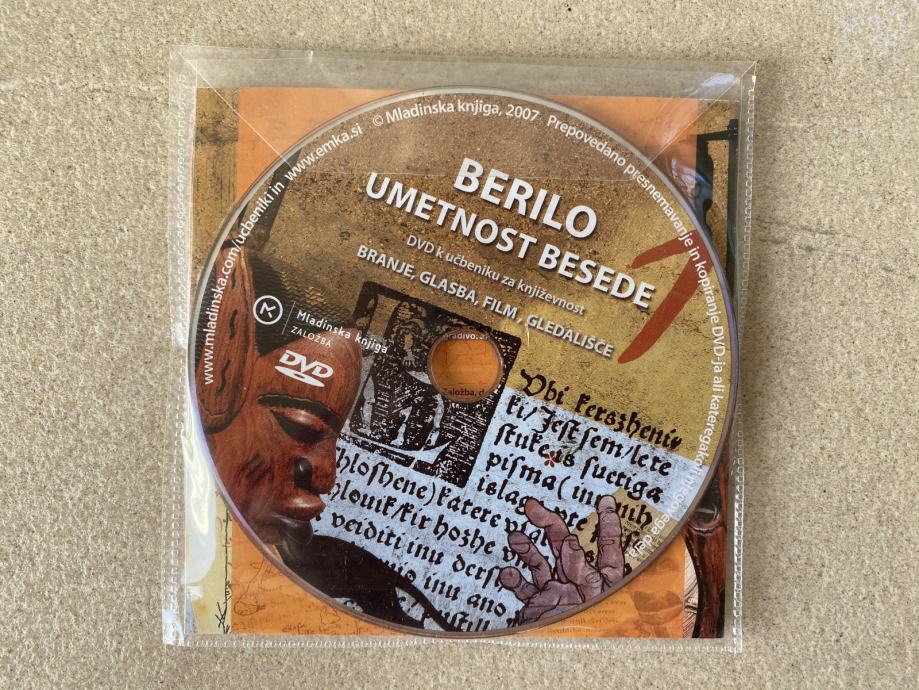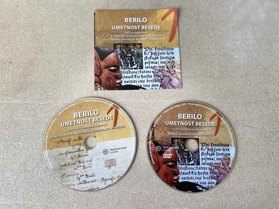 Prodam CD zgoščenko + DVD, ki sta komplet k učbeniku za književnost - BERILO 1 UMETNOST BESEDE za slovenščino v 1. letniku gimnazij in štiriletnih strokovnih šol, in sicer skupaj z zgibanko s kazalom ter sledeče vsebino gledaliških in filmskih posnetkov ter domumentarnih in glasbenih posnetkov ter interpretacij književnih odlomkov: