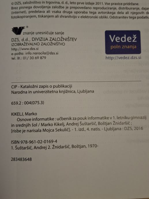 Ugodno prodam zelo dobro ohranjen učbenik Osnove informatike - za 1. letnik gimnazij in srednjih šol. Več informacij: 031 852 659