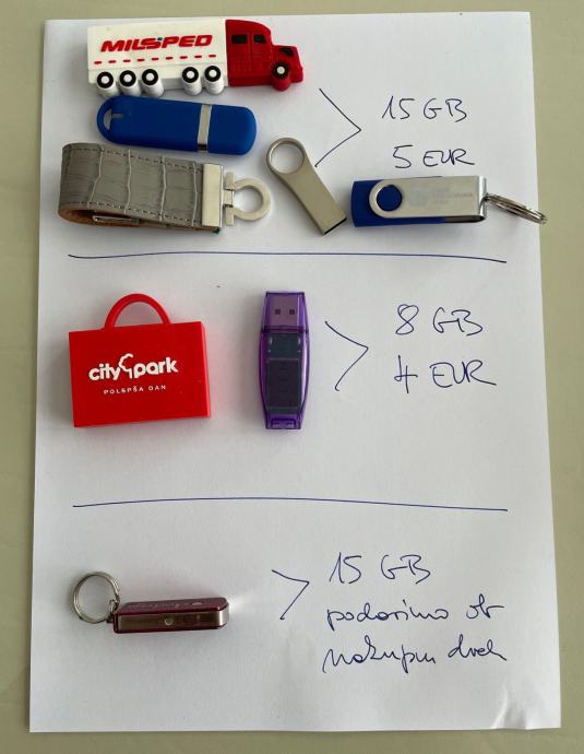 Ugodno prodam različne USB ključe, ki jih ne potrebujem več. Kapacitete od 8 do 15 GB. 4 EUR/ključ (2 x kapaciteta 8 GB), 5 EUR/ključ (5 x kapaciteta 15 GB). Ob nakupu dveh skupaj podarim 1 x USB ključ s kapaciteto 15 GB. (glej sliko) USB ključki so lepo ohranjeni in formatirani, delujejo brez trežav.