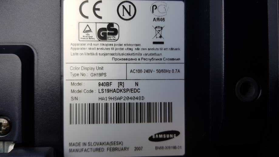 Prodam delujoč monitor Samsung 19 inčni Syncmaster 940BF.