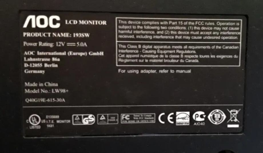 Prodam 19" LCD monitor AOC model 193SW, format 16:10, ločljivost 1440 x 900, svetilnost 300 cd/m², odzivni čas 5 ms.