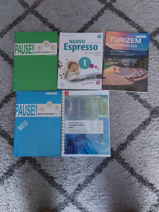 Učbenik za srednjo šolo. Turistični tehnik. Pause 1, pause 2, geografija ,nuovo espreso ,in Hotelska dela. Pause 1 cena 7€, pause 2 cena 7€,geografija 11€,nuovo espreso 17€ Hotelska dela 7€.Opomba. Zvezek Nuovo espreso je že prodan.