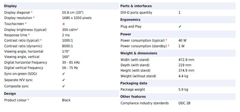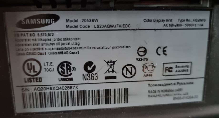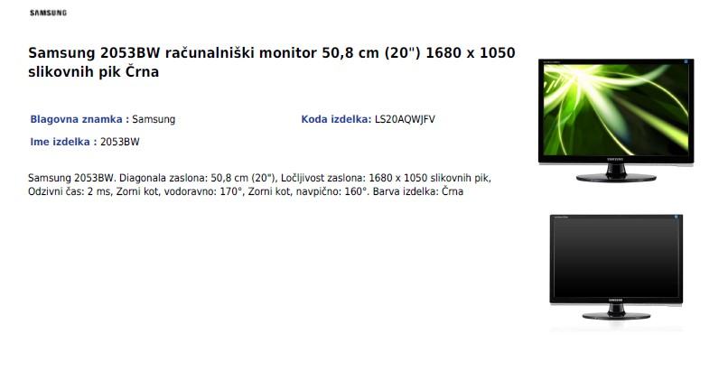 PRODAM Samsung 2053BW računalniški monitor 50,8 cm (20") 1680 x 1050 slikovnih pik Odzivni čas: 2 ms, Zorni kot, vodoravno: 170°, Zorni kot, navpično: 160°. Barva izdelka: Črna.Dogovor samo na . tel 031 239 337na sms ne odgovarjam