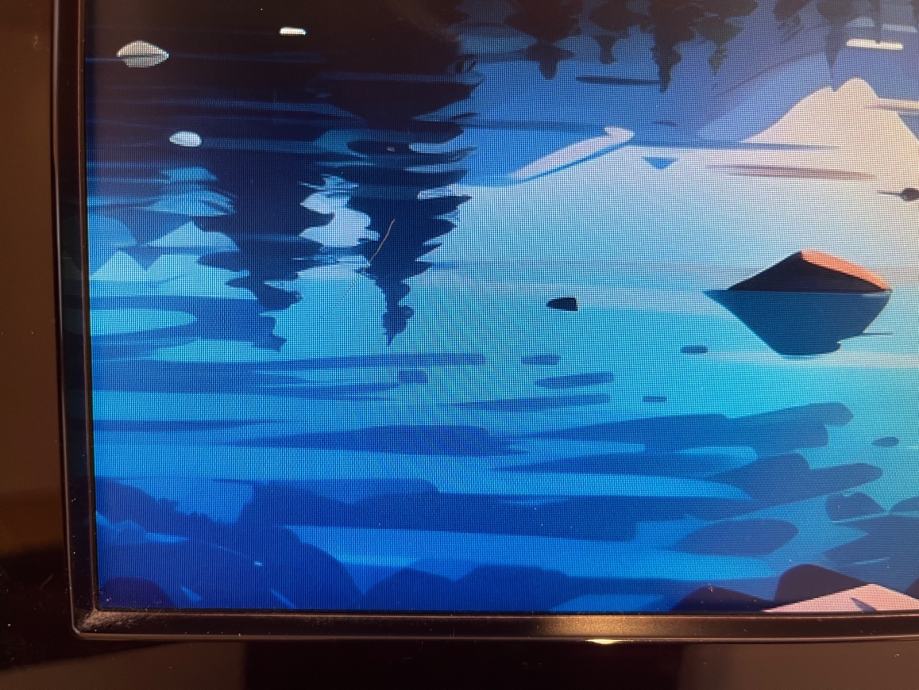 Monitor ima manjšo prasko na zaščitnem sloju v levem spodnjem delu. Sama matrika ni poškodovana. Vidno na drugi sliki.