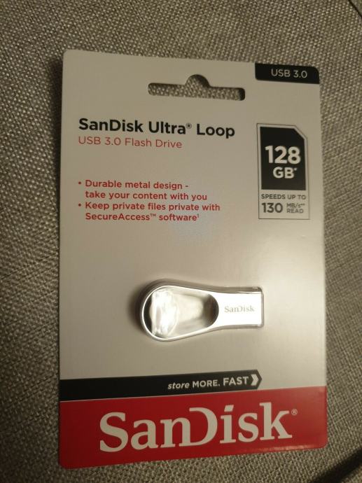Zaradi neuporabe prodam zapakiran ključek SanDisk Ultra Loop 128GB USB 3.0, s hitrostjo prenosa do 130 MB / s.