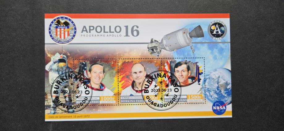 Apollo 16, vesolje - Burkina Faso 2023 -blok 3 znamk, žigosan (Rafl01)