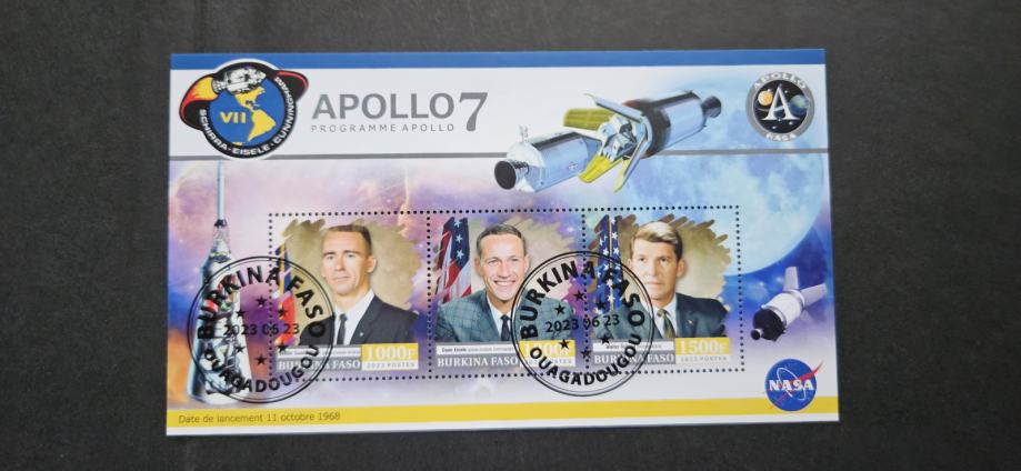 Apollo 7, vesolje - Burkina Faso 2023 - blok 3 znamk, žigosan (Rafl01)