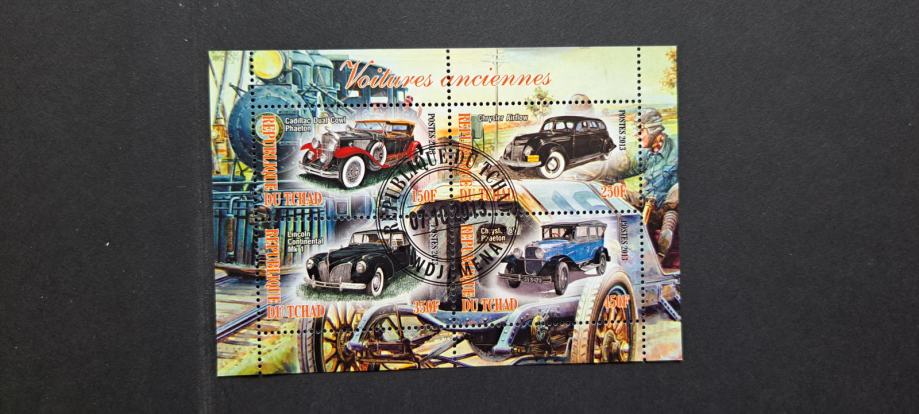 avtomobili, oldtimerji (II) - Čad 2013 -blok 4 znamk, žigosan (Rafl01)
