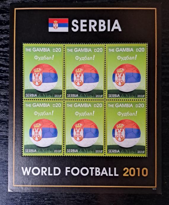 Prodajam dvojnike in ostale viške iz svoje zbirke. Gambija 2010, šport, nogomet – blok, mala pola team Srbija.