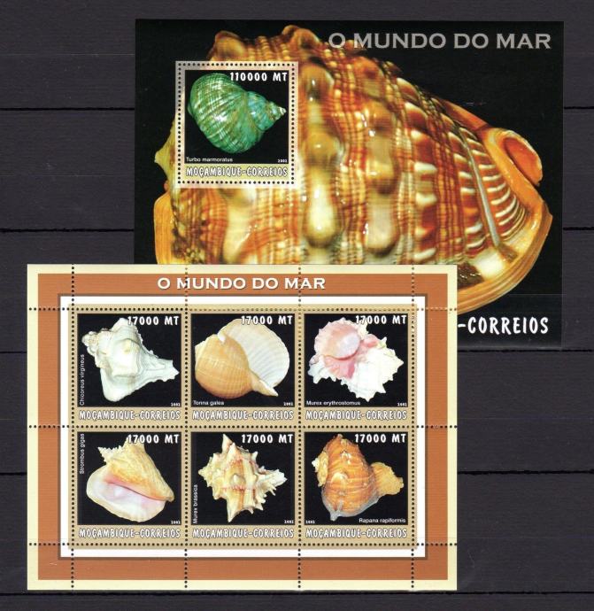 MOZAMBIK 2002 MORSKE ŽIVALI ŠKOLJKE ** Mi 2590/95+B173 ** MP+blok (88)