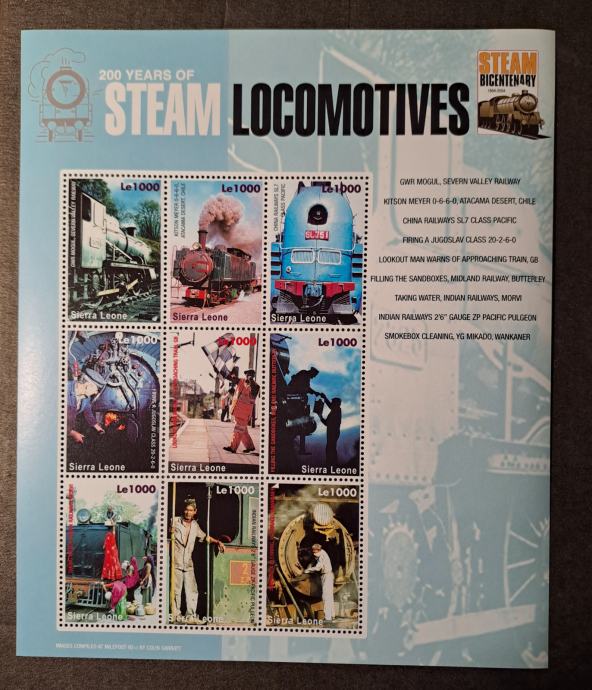Prodajam dvojnike in ostale viške iz svoje zbirke. Sierra Leone 2004, blok železnice, vlaki, lokomotive.
