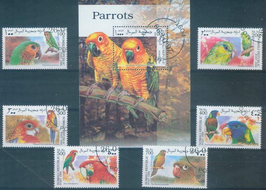 SOMALIJA ,PAPAGAJI 1999,ŽIGOSANE ZNAMKE, SERIJA IN BLOK,1999,