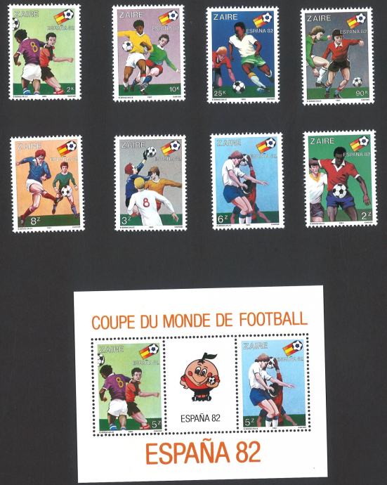 Znamke Zaire 1981 - nogomet Španija 1982 serija 8 znamk + blok. Znamke so nepoškodovane in nežigosane.