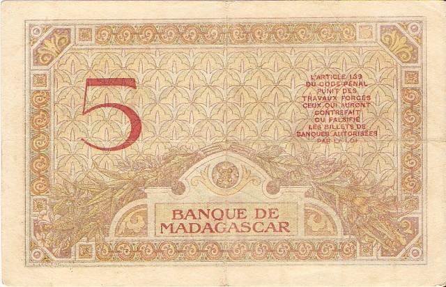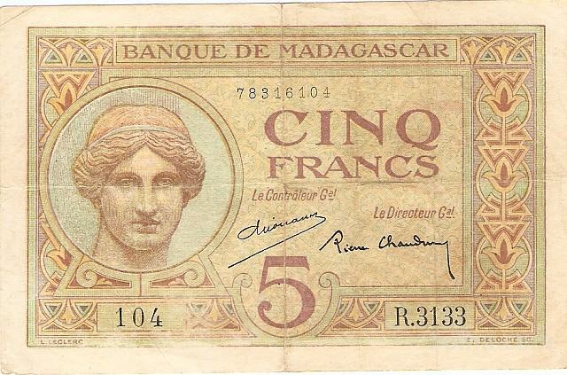 PRODAM REDEK BANKOVEC 5 FRANCS P-35 (MADAGASKAR) 1937. VF/XF Kvaliteta.