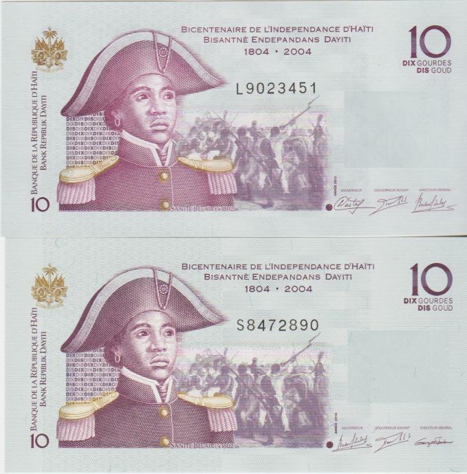 Prodam PRILOŽNOSTNI BANKOVEC 10 GOURDES P272e-2012 L in 10 GOURDES P272f-2016 S (1804-2004) (HAITI) UNC kvalitete.CENA JE ZA 1 BANKOVEC.