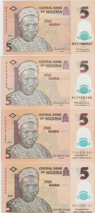 Prodam BANKOVC 5 NAIRE- P38c-2011, 5 NAIRE- P38d-2013 ,, 5 NAIRA P38l-2021 ,, 5 NAIRE- P38 -2022 (NIGERIJA) UNC - Kvaliteta.