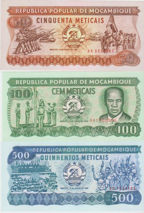 PRODAM BANKOVEC 50 METICAIS P129b-1986 CENA € 1,90 ,, 100 METICAIS P130c-1989 CENA € 2.90 IN 500 METICAIS P131b-1986 CENA € 4.90 (MOZAMBIK MOCAMBIQUE ) UNC - Kvaliteta.