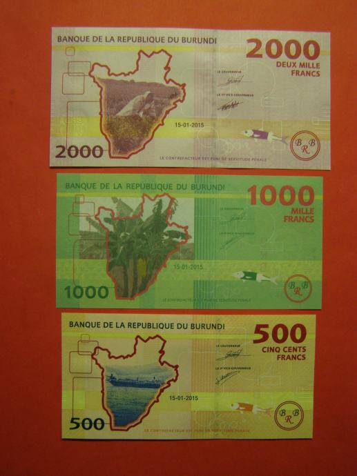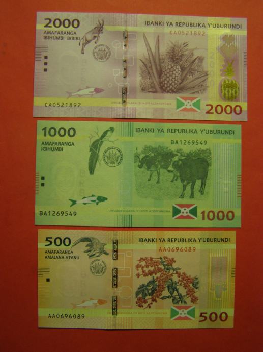 Prodam set bankovcev za 500, 100 in 2000 Frankov iz Burundija (500, 1000 in 2000 BIF), kot jih lahko vidite na fotografijah in so povsem novi - UNC kvalitete.
