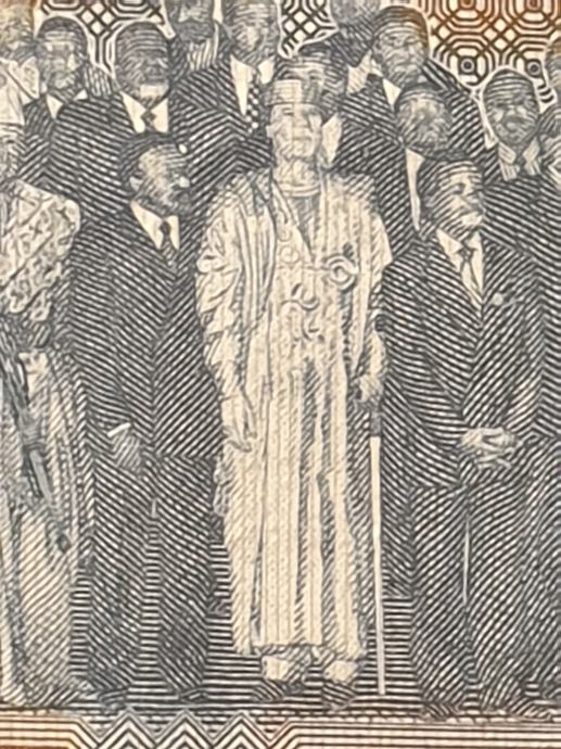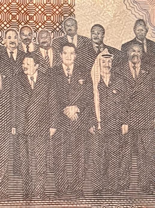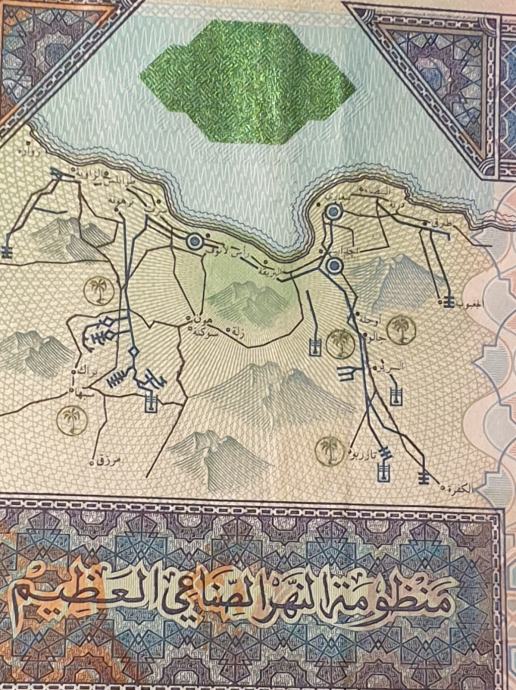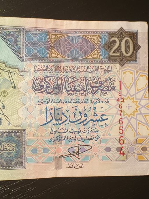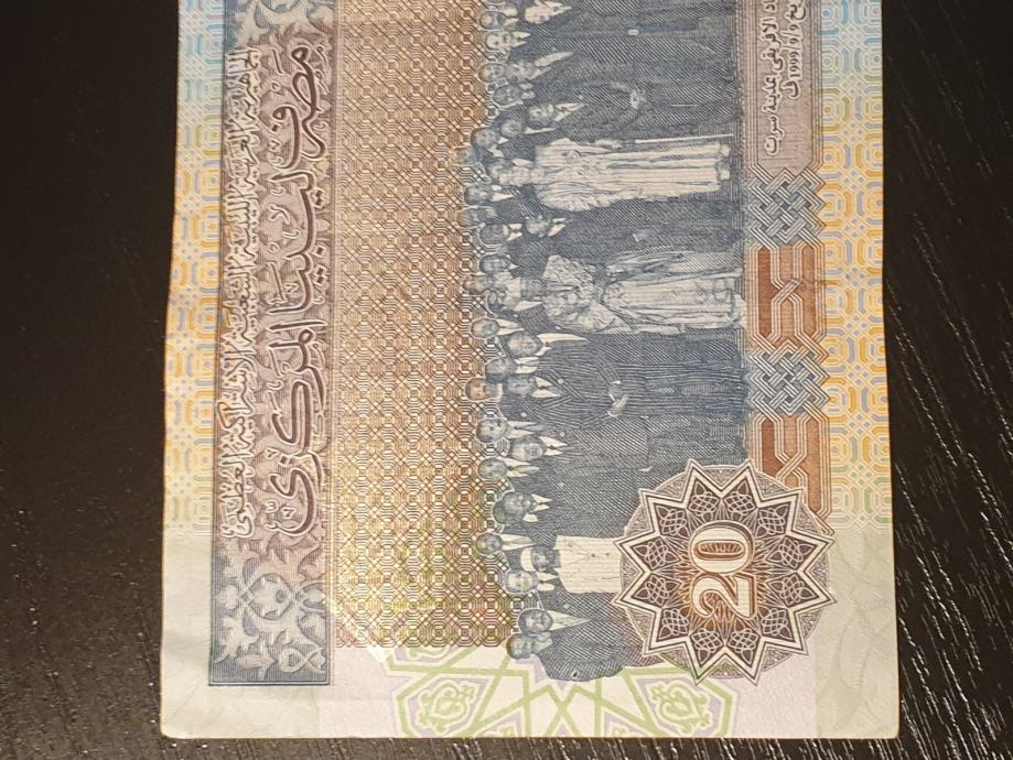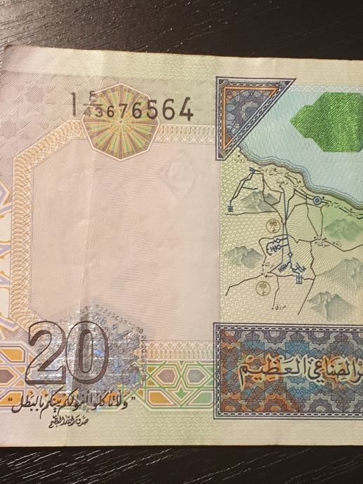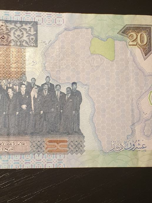 Bankovec iz libijske džamahirije v času, ko jo je vodil Gadafi in so bile proti državi napovedane najstrožje zahodne sankcije. Na skupinski sliki na hrbtni strani vidimo obraze afriških in bližnjevzhodnih voditeljev, udeležence enega od srečanj v Tripoliju, med njimi Jaserja Arafata.