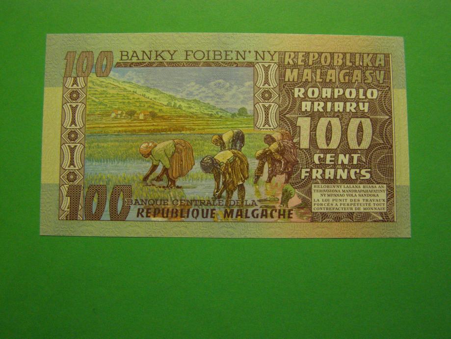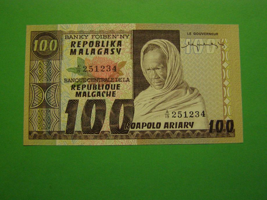 Prodam bankovec za 100 Frankov (100 MGF) iz Madagaskarja, kot ga lahko vidite na fotografijah. Bankovec je povsem nov - UNC kvalitete.