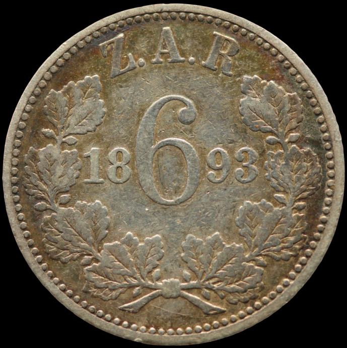LaZooRo: Južna Afrika 6 Pence 1893 XF redek mavrica - Srebro
