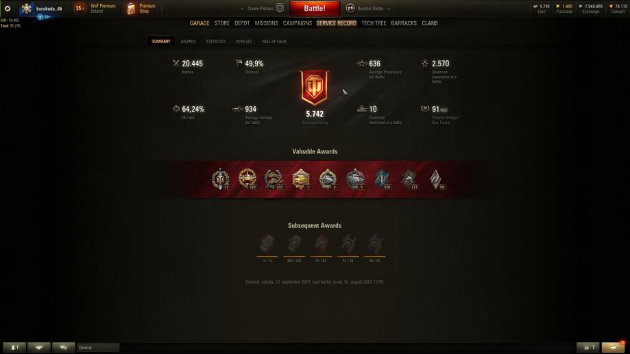 EU World of Tanks račun. 20.500+ bitk. Win ratio 49,85%. Personalni rejt 5728. 35x level 10 odklenjenih tankov. 28x level 8 premium tanki (Peregrine, Progetto 46, Obj. 703 II, Obj. 252U, Kpz 07 Rh,T44-100,T54 mod1, Bisonte C45, 50tp Prototyp, Škoda T27, HWK 30, Lt-432, Borrasque, M4A1 Rev, Type 59G, Renegade, M-IV-Y, EBR 75 FL 10, AMX M4 49, CS 52 lis, WZ-120-1G FT, Centurion 5/1 Raac, AMX CDA 105, Astron Rex 105, SU-130PM, Kannonejagdpanzer 105, Senlac, M41D). 3x level 7 premium tanki (Type 62, IS-2, AMX 13 57). 5x level 6 premium tanki (Tiger 131, Fury, M4A1 FL 10, Firefly VC, Rudy). Level 9 premium tanki AE Phase I, Char Futur 4, K-91-PT. Level 10 premium tank FV215b 183. Nekaj premium tankov v recovery (E25, Strv 81, Super Hellcat, T25, Aufkl. Panther, Excalibur, Super Chafee, M41 90mm, Stug IV, Pz. IV S, Type 64, Thunderbolt, Pz III K, M10 RBFM, T-50-2, VK 28.01 105, T78, Bretagne Panther). Improved equipment & bond equipment. 150+ personalnih rezerv. Veliko 2d stajlov. 3D stajli za tanke: Obj. 277, T110E3, AMX 50B, Rinoceronte, Udes 15/16, Centurion Action X, T30, 60TP, Tiger II, Leopard 1, Kpz. 07 Rh, IS-3, Obj. 268/4, Kranvagn, T110E4, Obj. 703 II, Vz. 55, 121, Maus, Conqueror GC, Jg. Pz. E100, Sheridan, Amx 13 105, Obj. 430, Obj. 140, TVP T50/51, M10 RBFM, WZ-111 5A, STB-1, E100, S.Conqueror. 300+ univerzalnih bluprintov plus vse zastavice držav 50+ za možnost odklepanja. Dobre ekipe na vseh tankih in vrstah. Vsi level 9 tanki odklenjeni, razen linije novih Italijanskih tank destrojerov. Račun aktiven od septembra 2015. Mest v barakah 213. V garaži 200 prostih mest za nove tanke. 13000 bondov na voljo za nakupe. Vsi level 8 premium tanki imajo field modifikacijo raziskano.