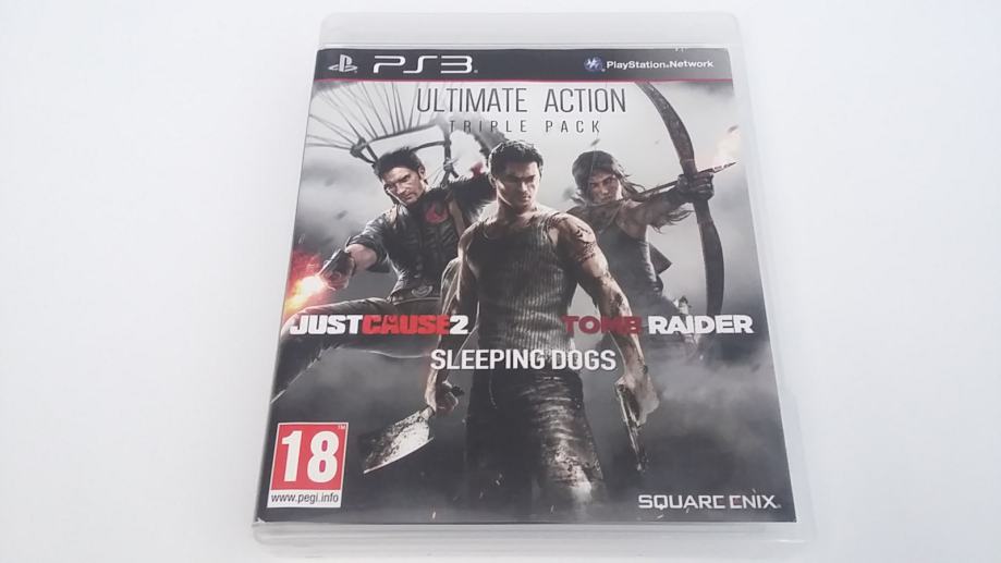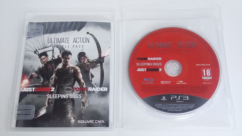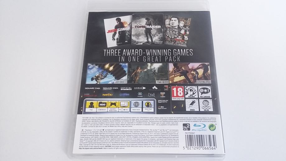 3 igre združene na 1 CD. Zbirka treh iger Just Cause 2, Sleeping Dogs in Tomb Raider za konzolo Playstation 3.