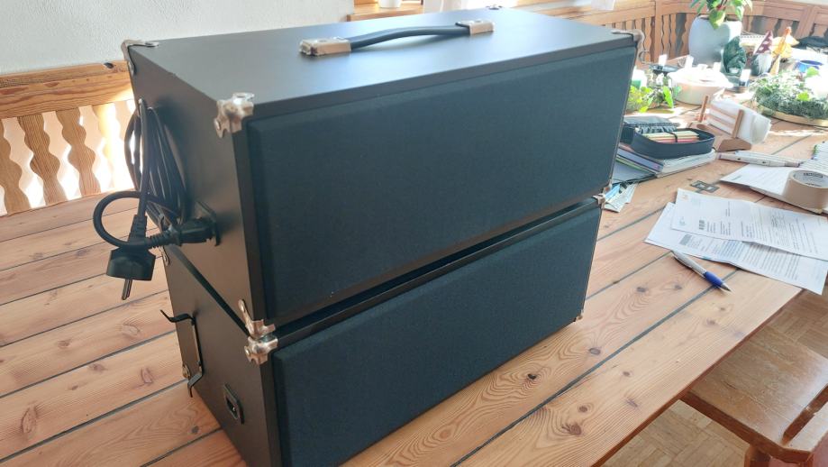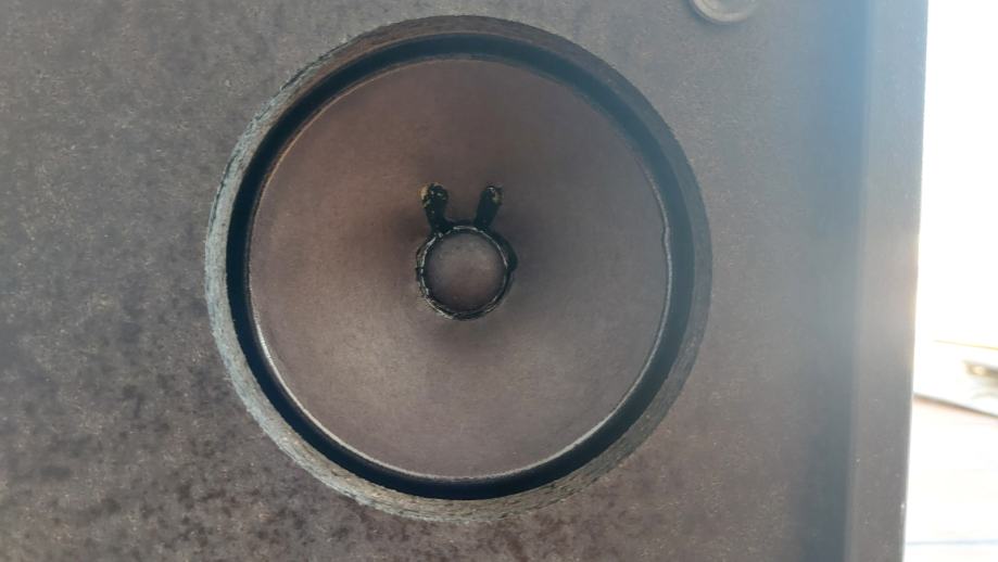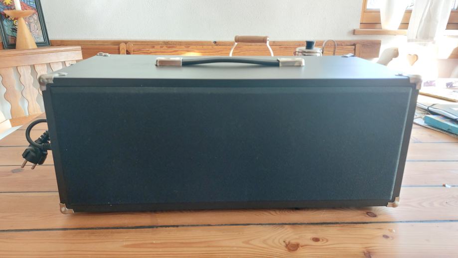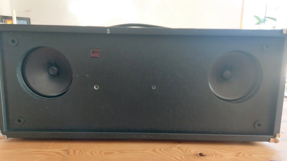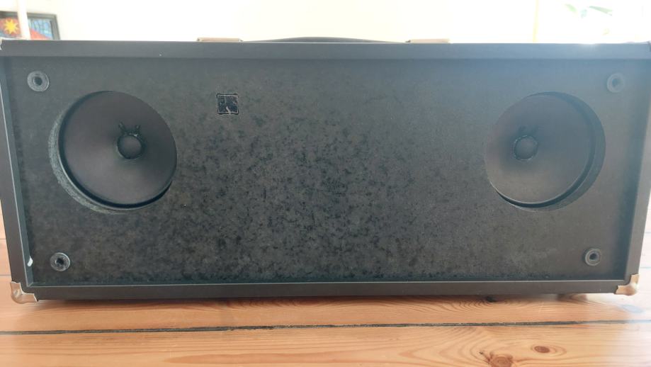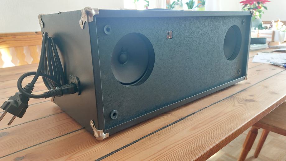 To so zvočniki ki so se ponavadi uporabljali v šolah, kot zdaj recimo blotooth zvočniki, samo da niso imeli baterij. Sta identična in zelo ohranjena malo uporabljena in vse deleju, možno ju je povezat, na eni strani gonilnika na drugi strani komande (mikrofoni, slušalke...). Le na enem ginilniku je sredinska kapica udrta. Zvok soliden, ni pa tak kot današnji zelo dober recimo JBLov zvok, ampak kakega poceni baterijkega zvočnika. Za kakega hobista če zamenja gonilnike z boljšimi. Se pa seveda že zdaj da kar solidno poslušat. Prodajam samo skupaj oba. 10kg!