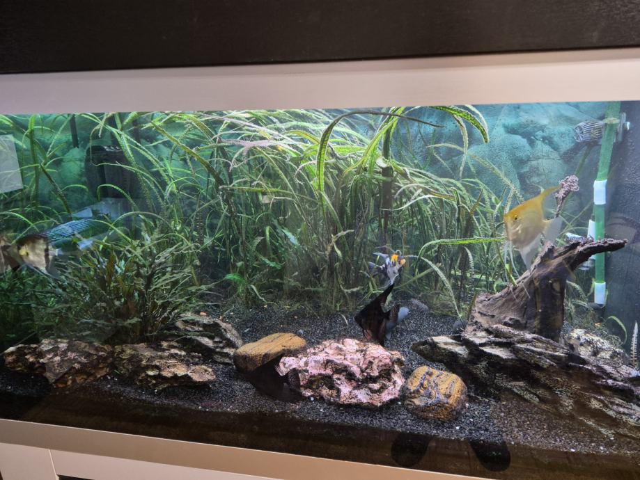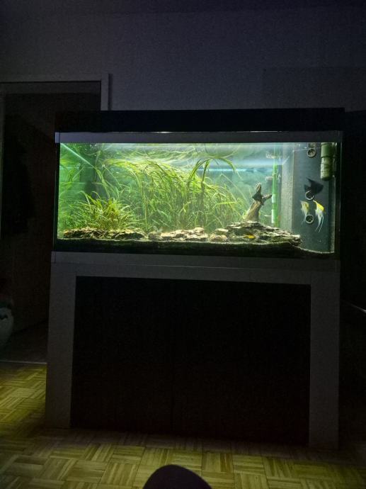 Prodam 600L z omarico in vso opremo z ribami in rastlinami te dekoracijo.6x led luči z nastavitev vklop in izklop.Sera c02 z 3kg jeklenko.2xčrpalka,notranji filter, dimenzija omare V-75,G80,Š-130cm ,akvarij V-60,š-130cm,G-70cm,pokrov je visok 10cm.