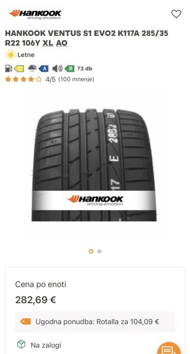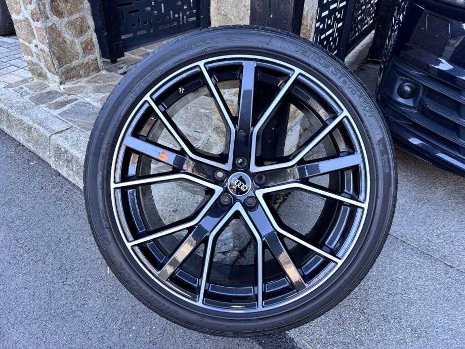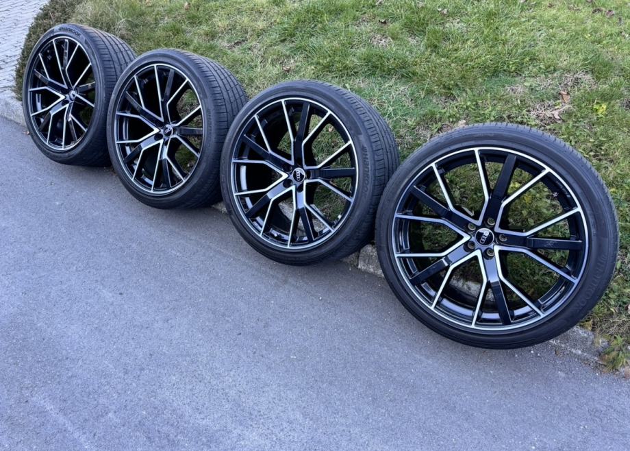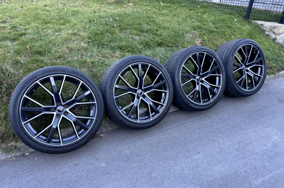 Prodam rabljena originalna alu platišča znamke Audi Sport Black,22 col,premer med vijaki 5x112mm,sredinska luknja 66,6mm,ET26,brez poškodb,z letnimi gumami Hankook Ventus S1 Evo2 SUV,dimenzije 285/35-22,dot0222,profil 7mm,nepoškodovane in enakomerno obrabljene.Gume so bile nove kupljene letos Junija v vrednosti 1200€ in vožene samo 2 meseca na Audiju Q7.Komplet je primeren tudi za Audi Q8 in Volkswagen Touareg.