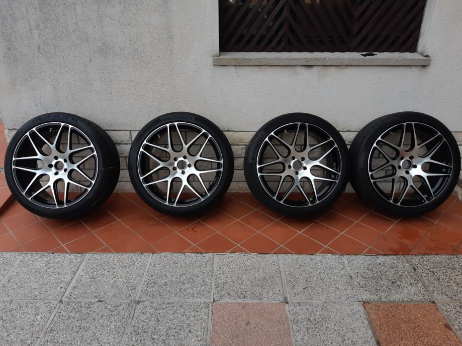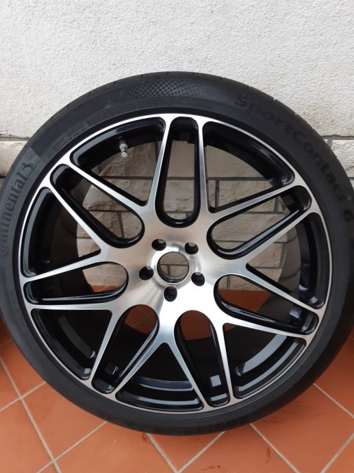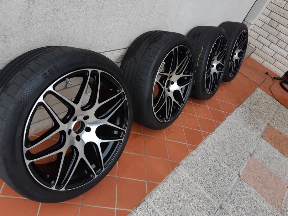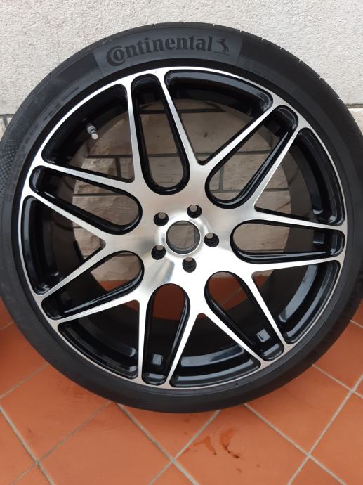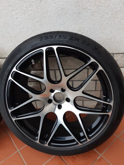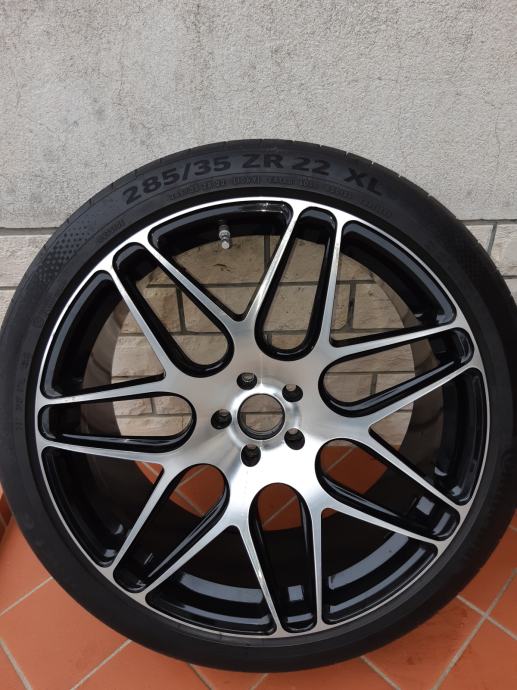 Poleg platišč PODARIM TPMS (senzorje za tlak-lahko se jih sprogramira pri vulkanizerju na katerikoli avtomobil) + komplet 20 vijakov z okrasnimi pokrovčki + že nameščene letne pnevmatike Continental 285/35/22, profila sicer cca. 3mm). TPMS senzorji so praktično novi, stari cca. 1 leto.