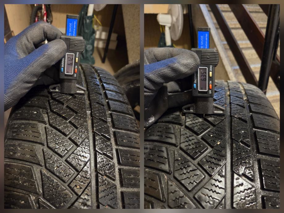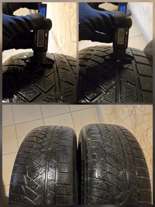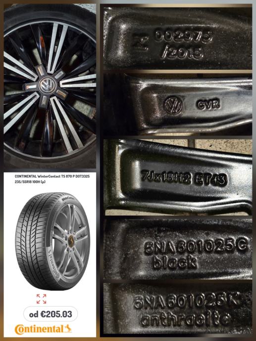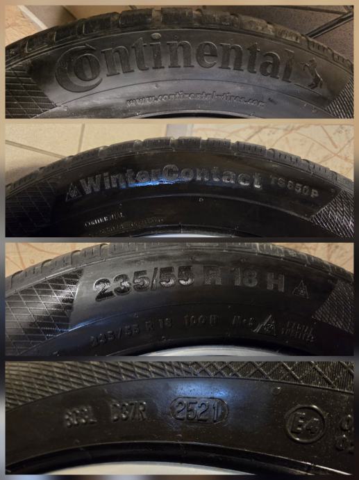 Nameščene so zimske pnevmatike 235/55 R18 100H XL Continental WinterContact TS850P DOT2521. Dve sta še dobri, imata cca 6mm profila dve sta pa že kar obrabljeni na cca 3,5mm profila, cena samo novega kompleta teh gum v trgovini je 800€. Gredo zraven platišč, ne vplivajo na ceno. Pokrovčki VW pa so petkraki, ki so na manjši sliki.