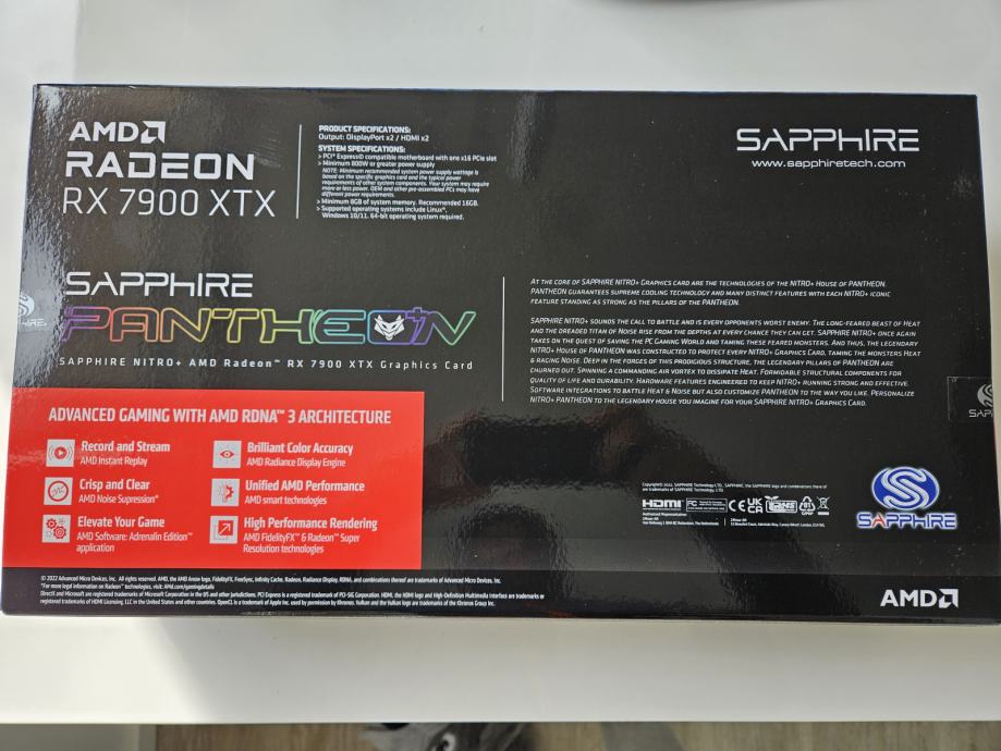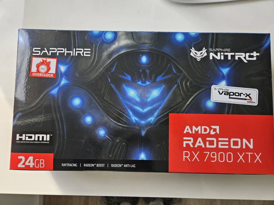 Prodam novo grafično kartico Sapphire NITRO+ AMD Radeon RX 7900 XTX Vapor-X 24GB grafična kartica, 24 GB GDDR6 (11322-01-40G). Grafične kartice še nisem odprl in je original tovarniško zaprta. Garancija je začela teči 15.3.2024 in ima 2 leti garancije. Prodam jo, ker jo ne bom potreboval. Cena je zadnja in menjave me ne zanimajo