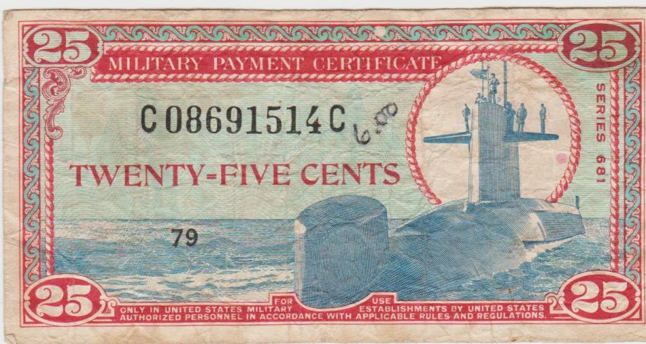 Prodam ZELO REDEK DENAR AMERIŠKE VOJSKE 5 CENTS P.M46-1968 ,, 10 CENTS P.M47-1968 ,, 25 CENTS P.M47-1968 IN 25 CENTS P.M77-1969 (ZDA AMERIKA) VF kvaliteta. CENA JE ZA 1 BANKOVEC.