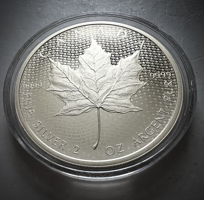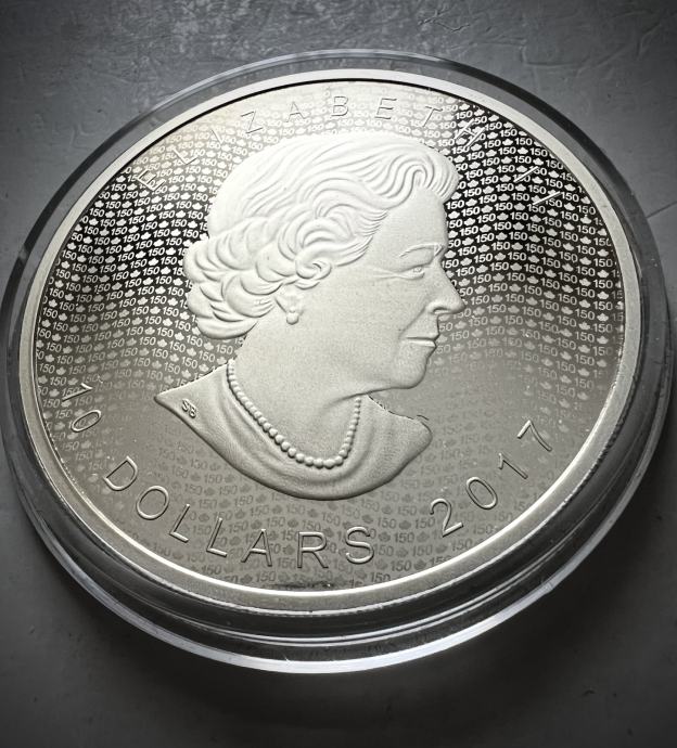 Srebrnik izdan leta 2017 ob 150. obletnici ustanovitve Kanade. Kovniška mojstrovina v matirano sijajni tehinki kovanja, z nežno zlatkasto patino.