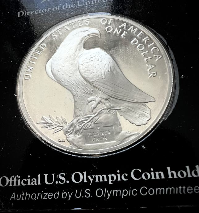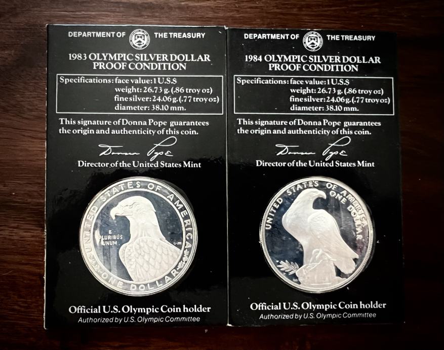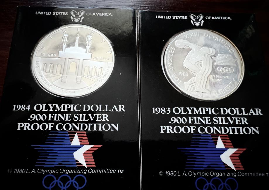 dva proof ameriška priložnostna srebrna dolarja, izdana za XXIII. olimpijske igre v Los Angeles: