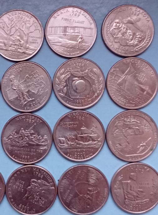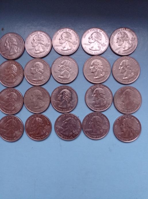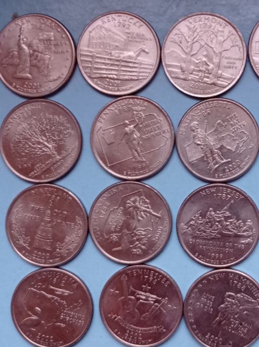Prodam komplet 16 kovancev 25 centov ZDA spominski, različne države ZDA , letniki 1999, 2000, 2001, 2002, 2003, 2006, 2018. Na sliki je 20 kovancev, 5 so že prodane.