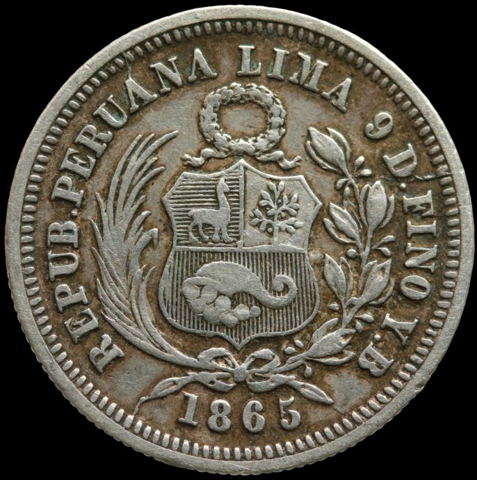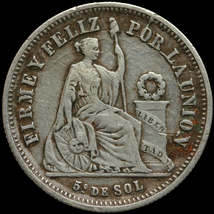 LaZooRo: Peru 1/5 Sol 1865 YB XF ghosting velika razpoka - srebro
