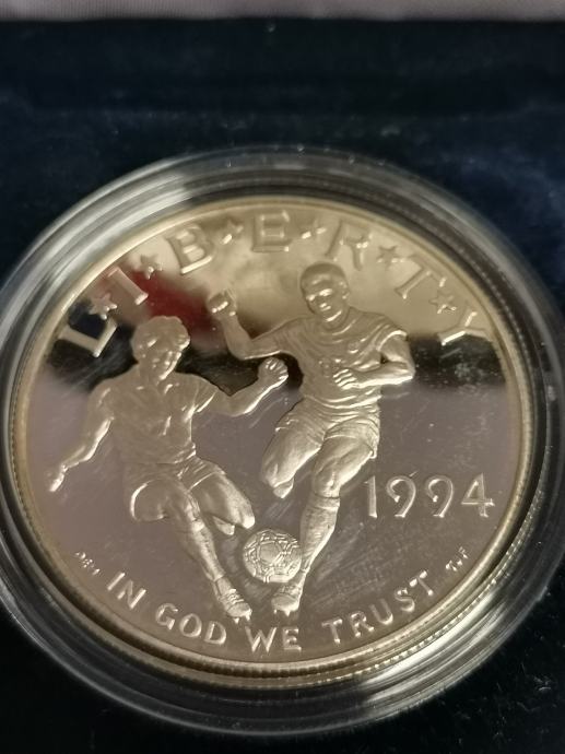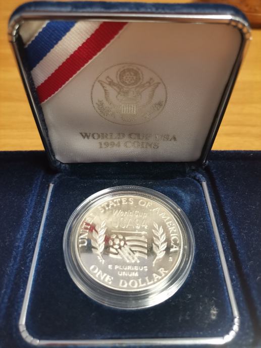 Spominski srebrnik ob prvem svetovnem prvenstvu v nogometu v ZDA, leta 1994. Srebrnik je uradno plačilno sredstvo v ZDA.