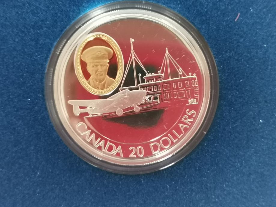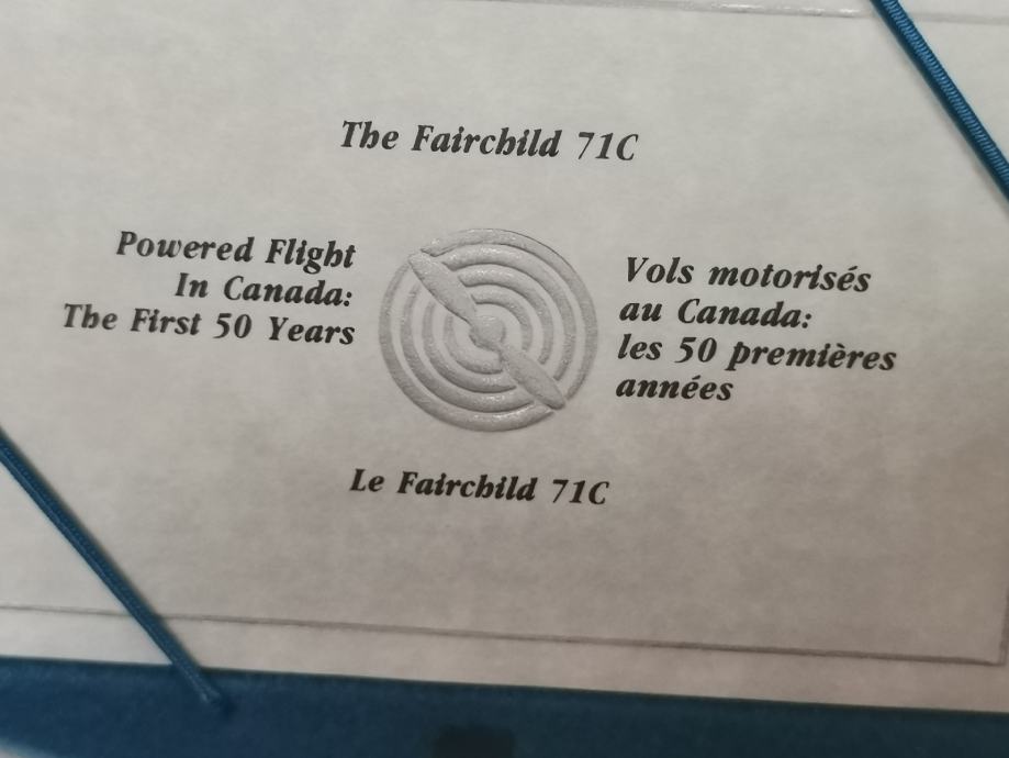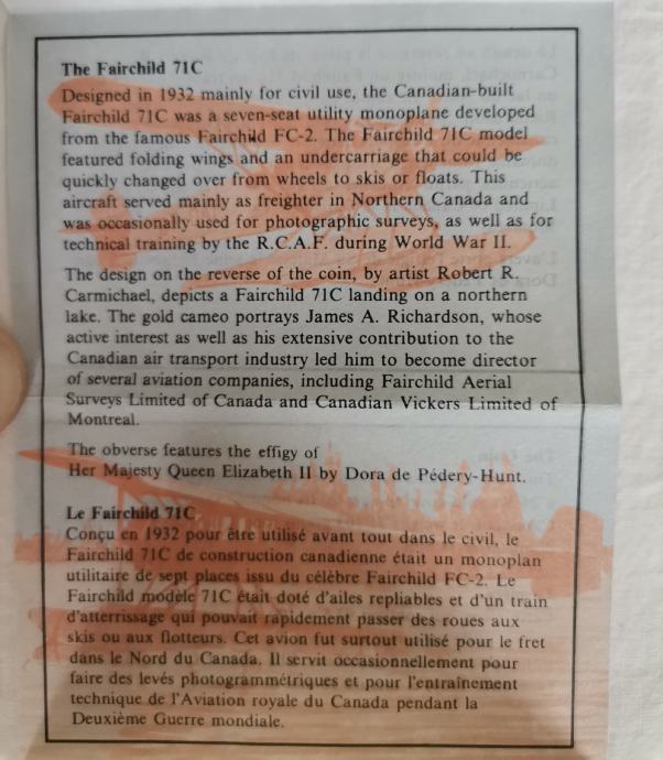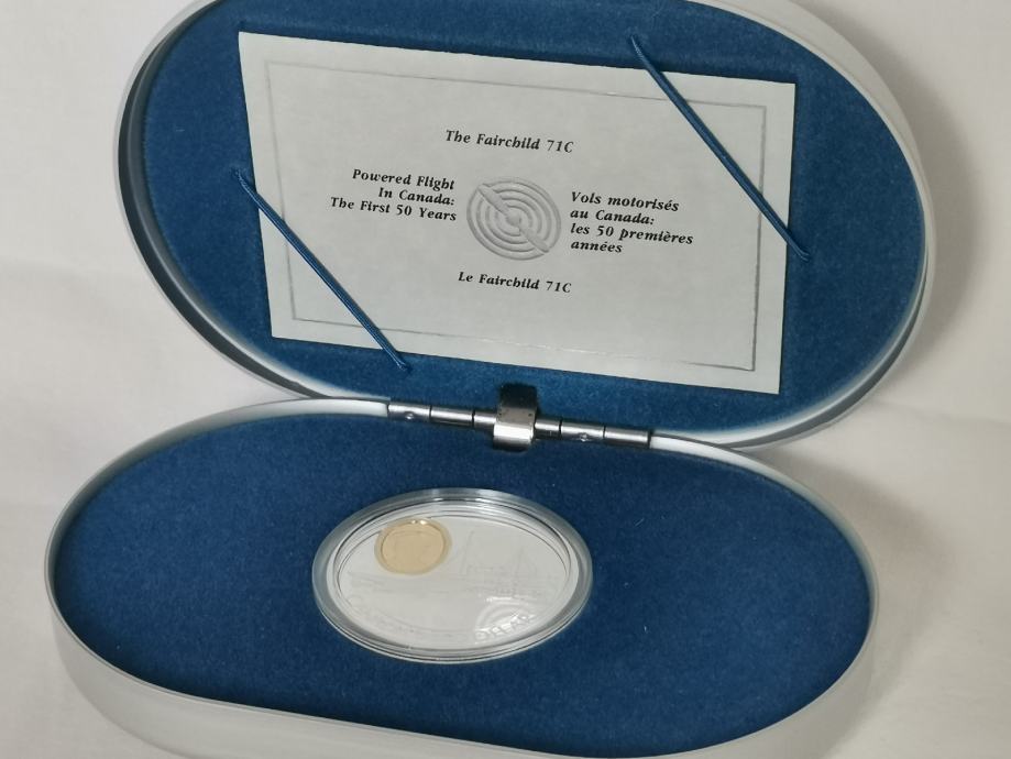 Srebrnik The Fairchild 71C - Motorno letenje v Kanadi, prvih 50 let. Kovanec je iz Sterling srebra 925/1000 z pozlačenim ovalnim emblemom. Pakiran v lepi kovinski škatli s certifikatom in kartonski škatlici.