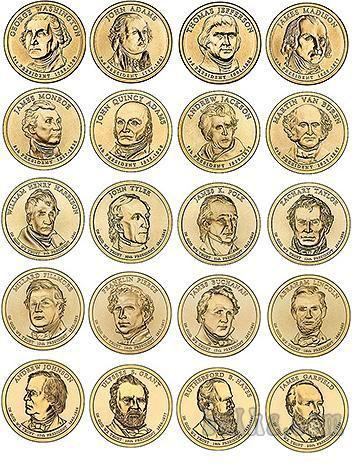 Posamezni priložnostni kovanci Presidential Dollars iz Združenih držav Amerike, ki že od leta 2007 izhajajo z motivi bivših predsednikov na dolarskih kovancih.
