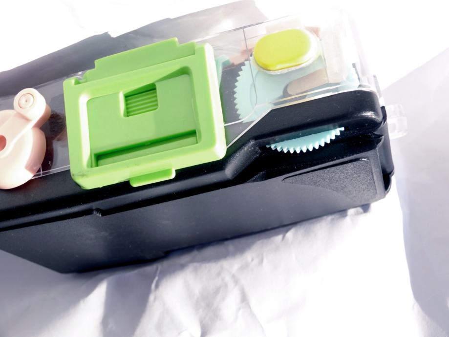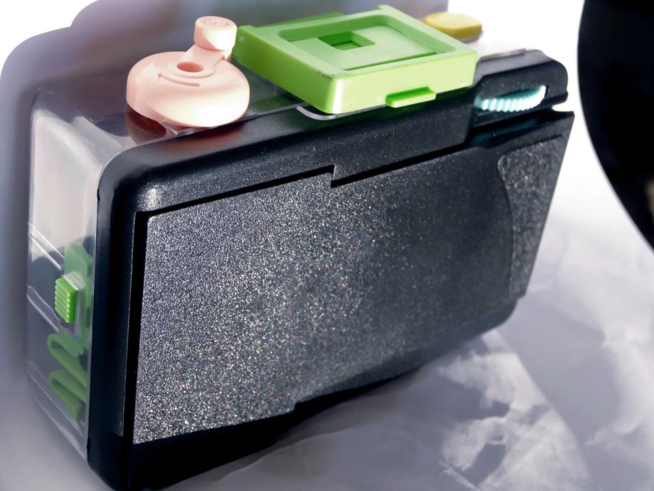Zanimiv aparat, ki deluje, kot, da bi ga v celoti natisnili s 3D tiskalnikom. Mislim, da bi ga dejansko lahko z izjemo stekelc in nekaj vzmeti ter vijakov. Poškodovana vrata (po vstavitvi filma jih je potrebno fiksirati z lepilnim trakom, kar ne predstavlja nek problem). Po pomoti sem zlomil plastičen nosilec. Sicer si upam reči praktično nerabljen. Lepo delujoč, ne potrebuje beterij. 4je posnetki na 1 film frame. Pošta 6 EUR.