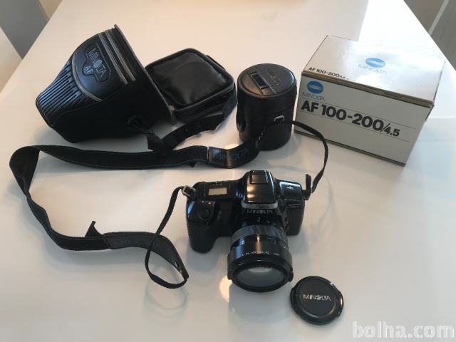 Ugodno prodam fotoaparat Minolta Dynax 5000i v okvari skupaj z brezhibnima objektivoma AF35-105 F3.5-4.5 in AF100-200 F4.5 in s sončnimi zaslonkami. Ob nakupu brezplačno priložim še UV in Skylight filter, ter torbico za nošenje.
