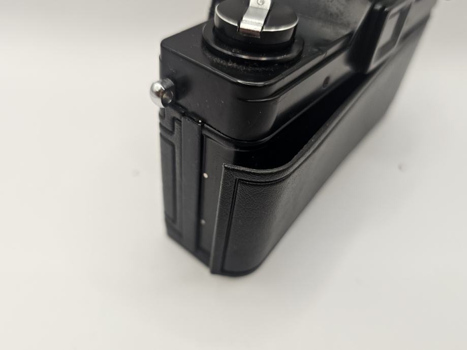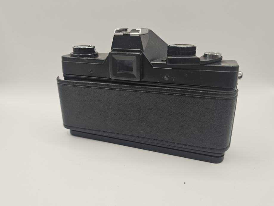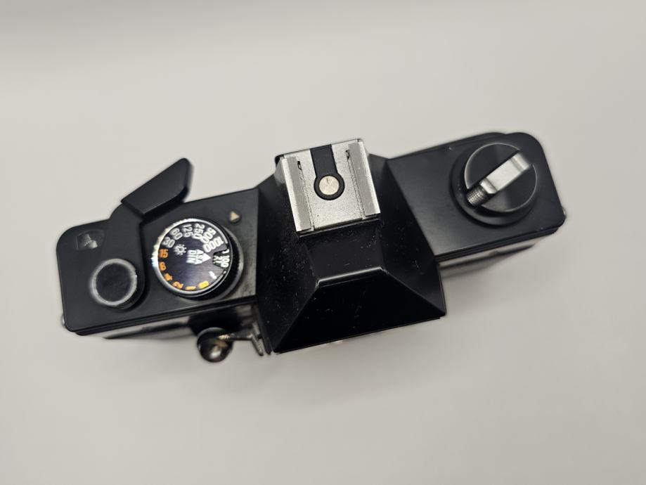 Rabljena in dobro ohranjena analogna SLR kamera. Na zadnji strani se je odlepil usnjeni del ohišja, sicer pa je aparat dobro ohranjen in pripravljen za uporabo.