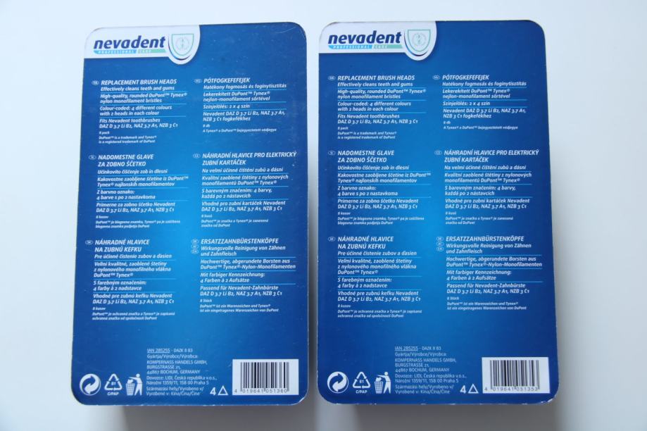 Prodam 2 kompleta novih zobnih ščetk/glav, za električno zobne ščetke Nevadent DAZ D 3.7 Li B2, NAZ 3.7 A1 in NZB 3 C1.