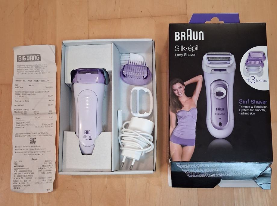 Prodajam skoraj popolnoma nov damski brivnik BRAUN LS5560. Kupljen je bil kot darilo hčeri, ki je po odprtju škatle in parih minutah uporabe ugotovila, da gre za brivnik in ne za depilator. Kupljen je bil 29. 7. 2025, kar pomeni da je še 1 leto in 8 mesecev v garanciji. Račun seveda prilagam izdelku. Podrobnosti o izdelku si lahko ogledate tukaj https://www.bigbang.si/ls5560-depilator-braun-izdelek-610433/