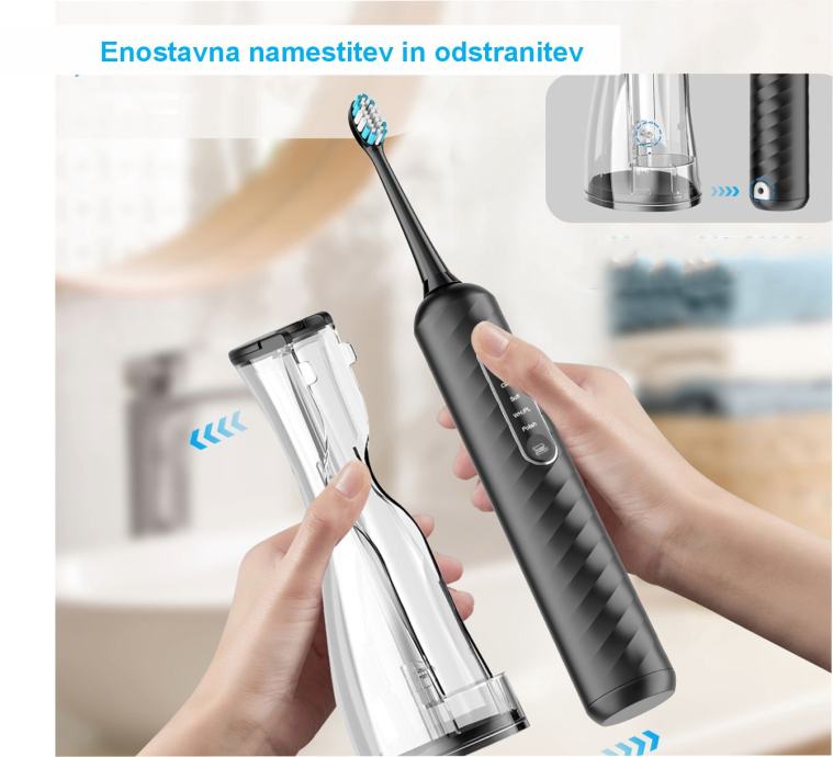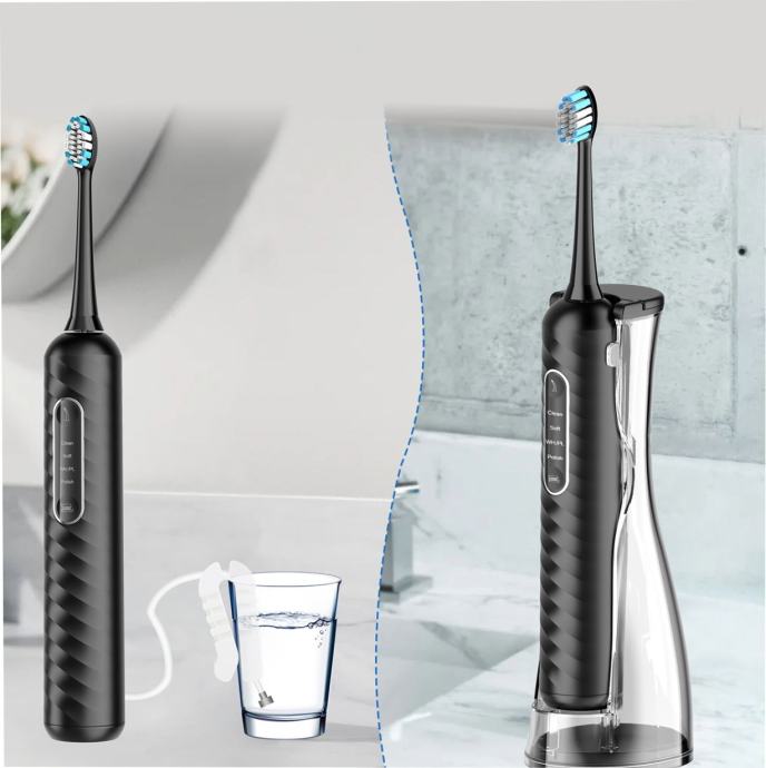 Naša električna zobna ščetka ima edinstveno zasnovo. Glava ščetke je zasnovana z dvema izhodoma za vodo, ki lahko med ščetkanjem pršita vodo, dvojno čistita vsak kotiček vaših zob in dlesni ter učinkovito odstranjujeta ostanke hrane, skrite v globini. Več načinov