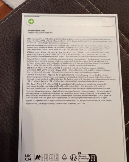 Naprodaj iPhone 15ProMax v barvi črnega titana z 256 GB s polnilnim kablom USB-C.