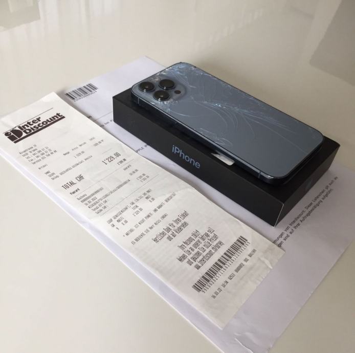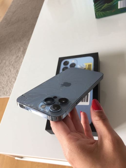 iPhone 13 Pro Max je poškodovan samo na zadnji strani, kar je razvidno iz fotografij, vendar to ne vpliva na funkcionalnost.